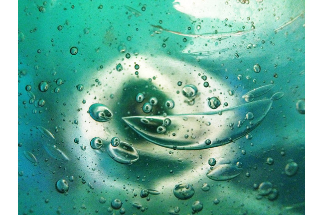 [This photograph shows inclusions in a round glass fishing float. These devices were once used by fishermen worldwide to keep their nets afloat in the ocean. Many fishing floats are still adrift. Some eventually wash ashore and become collectors’ items.]