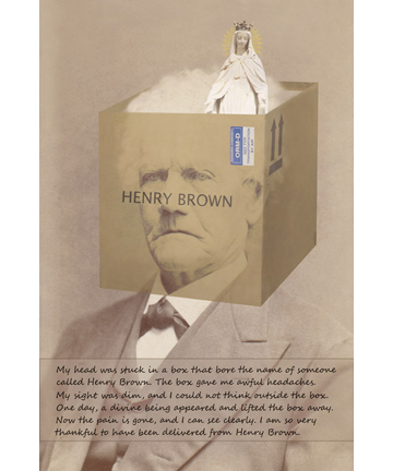 My head was stuck in a box that bore the name of someone called Henry Brown. The box gave me awful headaches. My sight was dim, and I could not think outside the box.One day, a divine being appeared and lifted the box away. Now the pain is gone, and I can see clearly. I am so very thankful to have been delivered from Henry Brown.