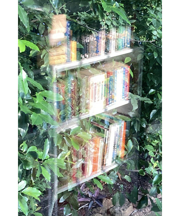 [This photograph is not a collage. On the longest day of the year, the morning sun cast a reflection through an adjoining window and copied the bookcase onto a nearby leafy fence.]