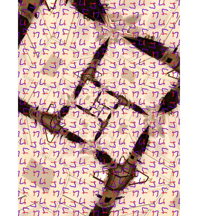 [This image was produced by aiming a kaleidoscopic camera lens at a small portion of my living room. The red and blue squiggles were later added with tessellation software.]