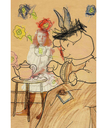 [Tea Party, the latest image in my Card Games series, is both my newest work and my earliest surviving work. It features a page that I colored when I was 3 years old. To create the photo-collage, I added the unknown little girl, whose portrait probably dates from the early 20th century. Like the other images in the Card Games series, this one deals with identity, boundaries, time/space, and reality versus imagination.]