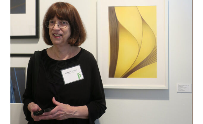 [With my print “Canaries” at the opening reception of the 35th Annual Juried Membership Exhibition, Houston Center for Photography, July 14, 2017. In my artist’s talk, I quoted the above lines from Franz Kafka to emphasize that photographers can often find wonderful subjects within arm’s reach, as I did with sticky notes. Photograph courtesy of Marjorie Jackson.]