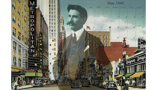 [This new addition to my Card Games series shows my grandfather, as a young man, strolling across Main Street in downtown Houston circa 1940. In reality, my grandfather was 65 years old in 1940 and never visited Houston.]